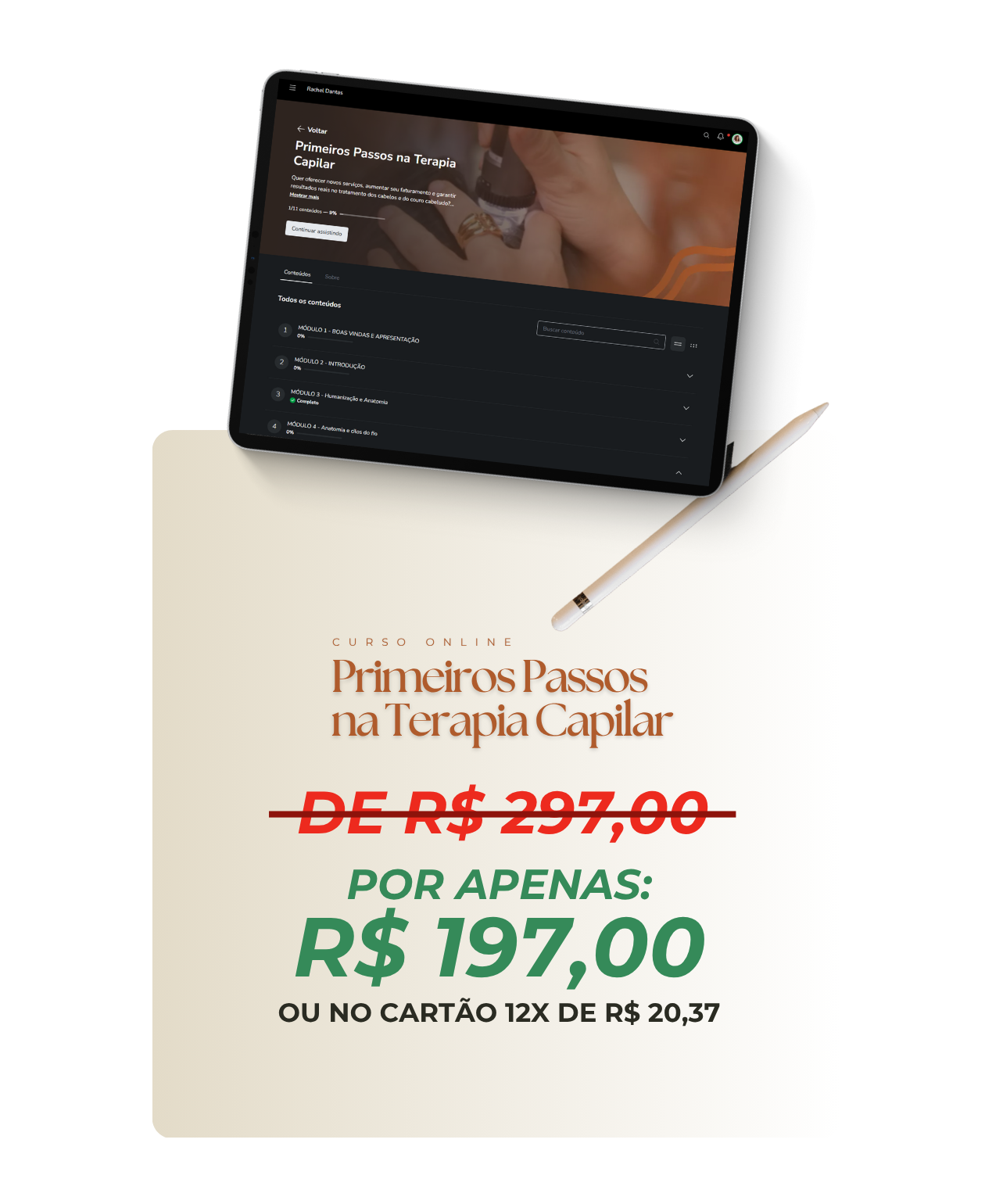 Este curso foi criado para te ensinar como incluir a terapia capilar de forma correta, segura e profissional elevando seus resultados e o valor do seu serviço.